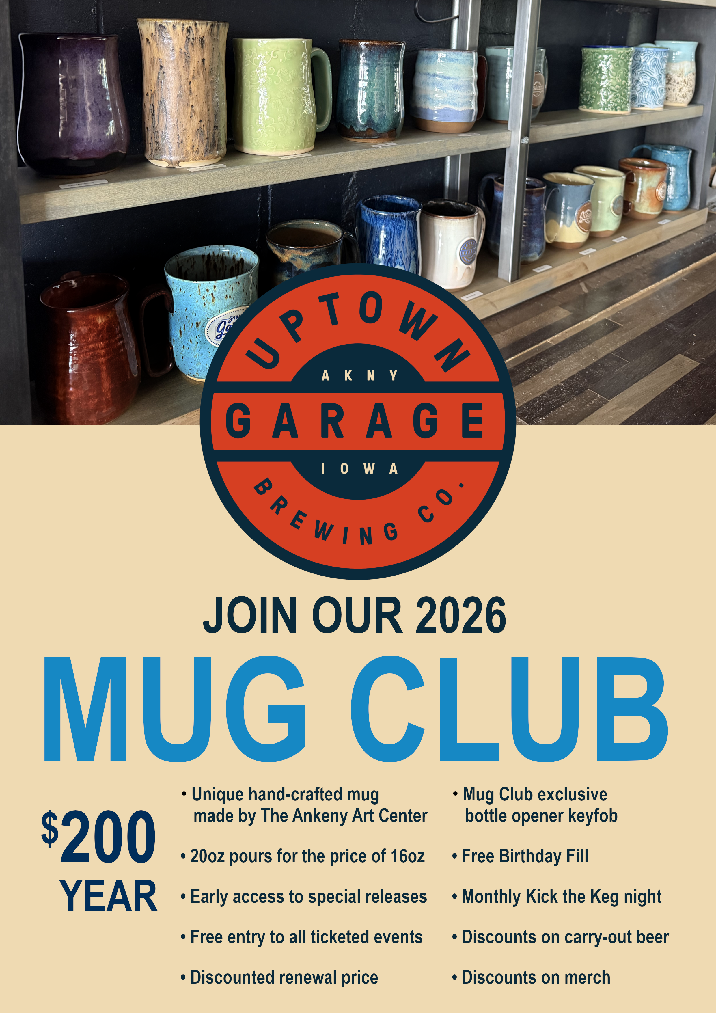 Stop in and slide on up to the longest bar in the Des Moines metro and enjoy a soda, canned cocktail, wine, or one of the 30+ rotating beers and ciders we’ve got on tap. What was once an old Ford showroom and garage, Uptown Garage Brewing Company provides a modern taproom experience in a setting that’s preserved the character of its past. Vintage automotive signs and original dealership decor line the walls of the 5000 square-foot taproom providing the perfect casual environment to enjoy a tasty beverage. To round out the experience, Uptown Garage Brewing Company has a stage for live music, a large outdoor patio with plenty of seating and games, a state of the art Uneekor Golf Simulator, and even a spot for the kids! All right in the heart of the Uptown District in Ankeny, Iowa.